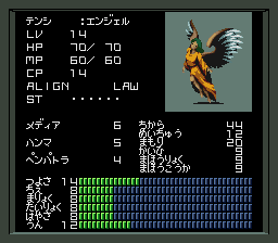 恶魔资料检索,用来检索目前已经碰到过的恶魔的资料。注意只有碰上后交战取胜过的恶魔的资料才会收录到这里边;还有在战斗画面状态下使用这部程序的功能有所不同,是察看当前恶魔的信息。SFC版的恶魔资料记录的总条数有限制;PS版可以根据不同的条件对恶魔进行排序,以方便检索。
